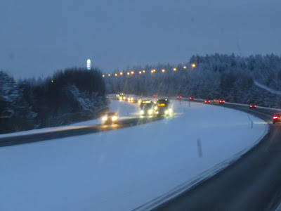 Linda a rodovia ao anoitecer coberta de neve nos lados.